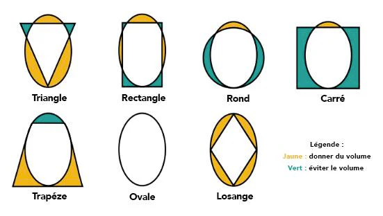 • Triangulaire (front étroit, mâchoire large) : volume en haut qui rééquilibre.