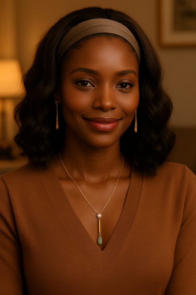 Cet univers prolonge la perruque : une femme raffinée, enveloppée dans des textures chaleureuses, où chaque détail reflète la neutralité sophistiquée de son profil.