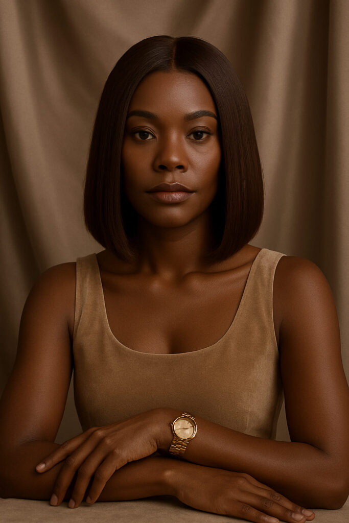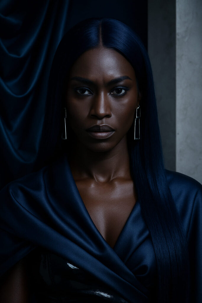 Coiffures harmonieuses : perruques sleek lisses 22″ à 26″, raie centrale, textures droites ou légèrement tendues, nuances noir profond ou bleu nuit.