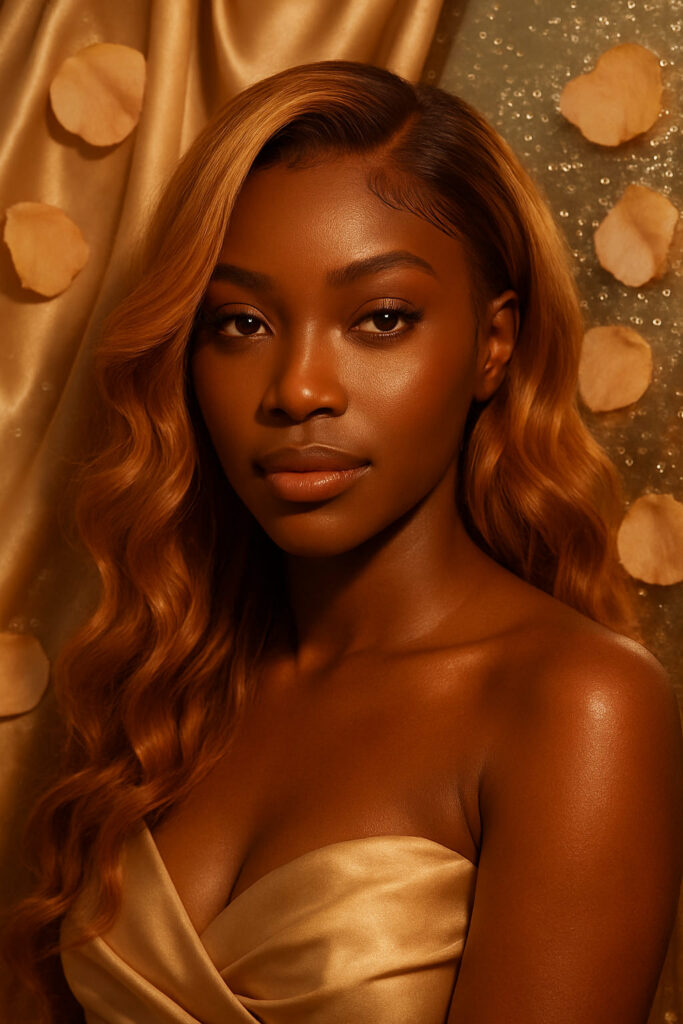 | Romantique | Lob ondulé, boucles fluides, curtain bangs | Loose Wave, Water Wave | 12–20″ · 180% | Caramel P4/27/30, Miel Rayonnant™ #27, cuivrés doux #33/T33/30 |