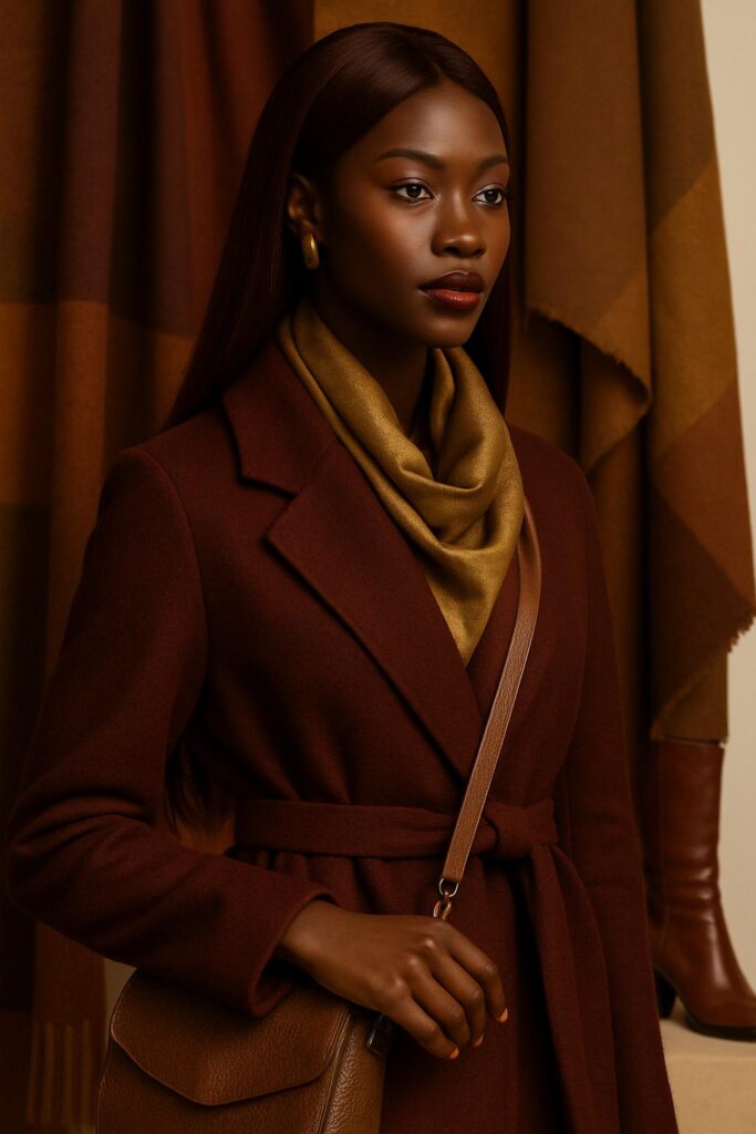 Le manteau Bronze Caramel Foncé⹠(Pantone 7596 C) structure la silhouette tout en lâenveloppant.