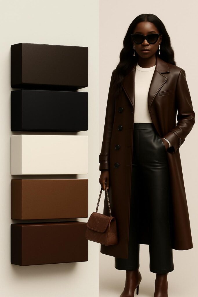 - Rester dans la zone neutre du spectre : tons moka, taupe, brun équilibré, miel désaturé.