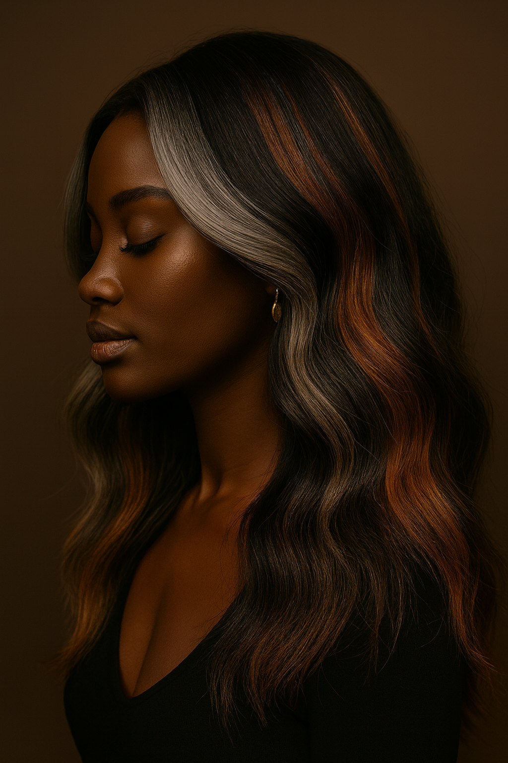 Nuance : base noire, mèches gris cendré froid + cuivre chaud → fort contraste bicolore.