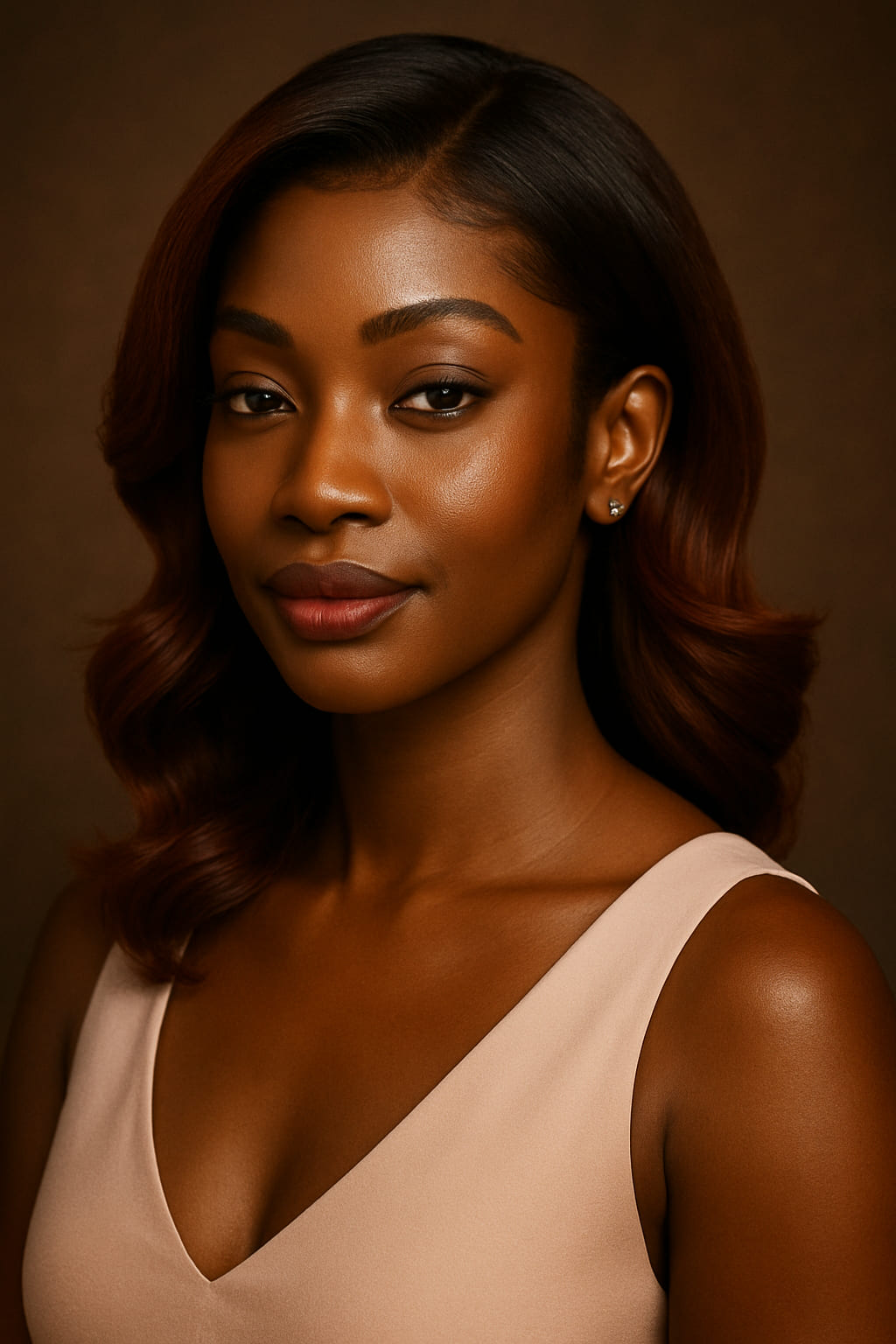 Favoriser des bijoux dorés ou cuivrés, courts ou mi-longs, qui prolongent les lignes arrondies du visage. Les créoles fines et pendentifs centrés renforcent la douceur lumineuse de l’acajou. Éviter l’argent et les teintes froides qui durciraient la chaleur du modèle.