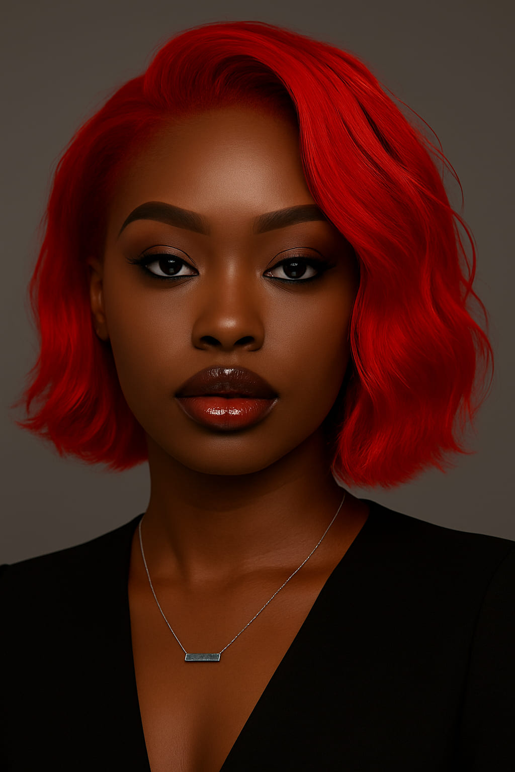 L’ondulation du pouvoir : une coupe sculptée, une diagonale de lumière et un rouge écarlate qui magnifie les carnations chaudes tout en structurant le visage.
