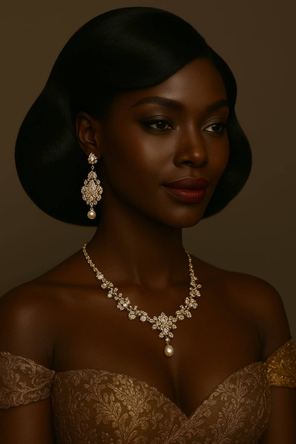 Bijoux : dorés, perles baroques, colliers ras de cou majestueux.