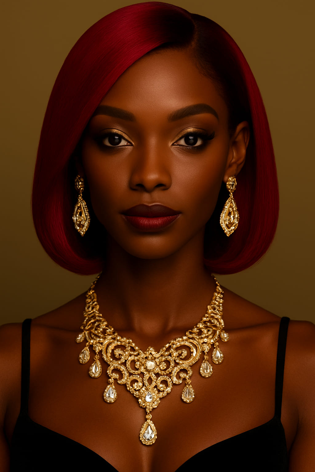 Cléa™ – Pourpre Yoruba™ exprime l’autorité et la noblesse des couleurs royales africaines. Sa texture Silky Straight en carré lisse se pare d’un pourpre profond qui intensifie la féminité et l’élégance. Elle sublime les visages ovales par sa polyvalence, structure les rectangulaires en adoucissant leurs lignes, et illumine les visages en cœur en ramenant l’attention vers les traits centraux.