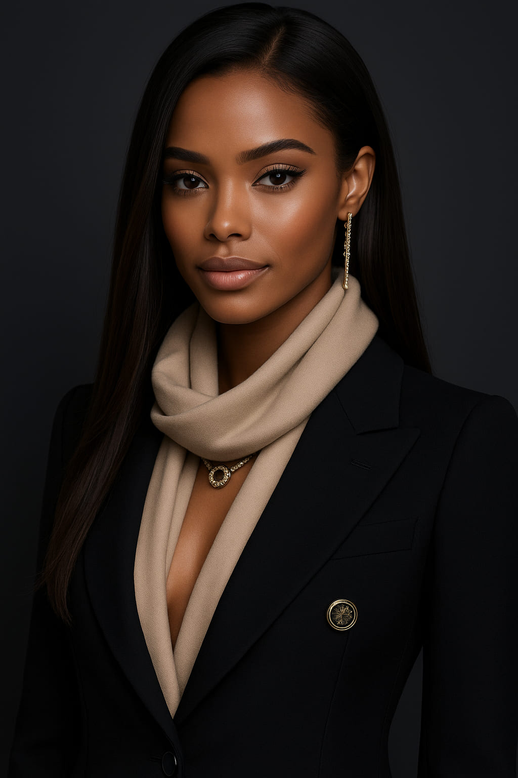 Le noir intense épouse la profondeur de la carnation, renforçant l’aura hiératique et le magnétisme naturel.