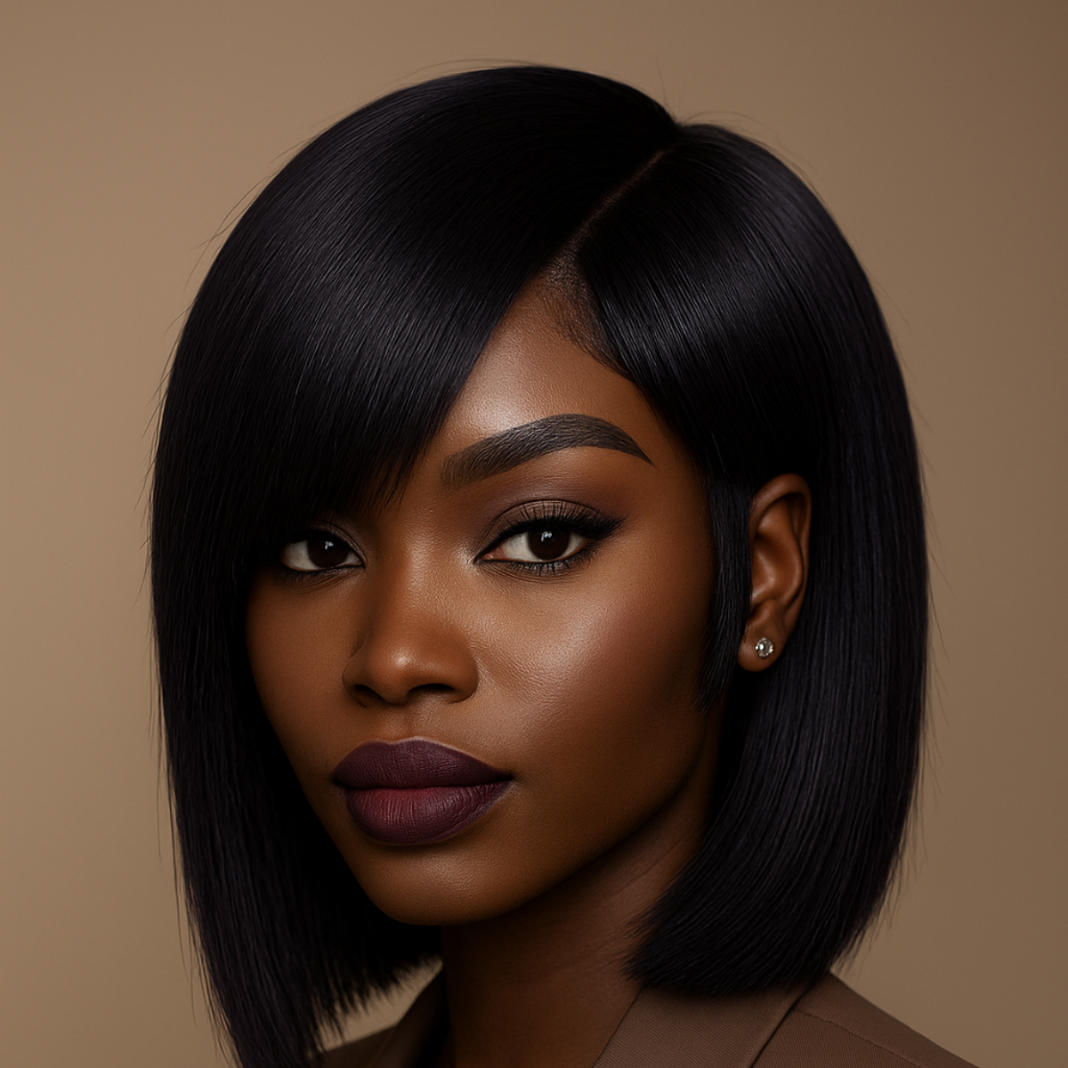 Structurée et élégante, cette perruque incarne la précision moderne avec un carré lisse sophistiqué, révélant une raie latérale nette et un noir profond lumineux.