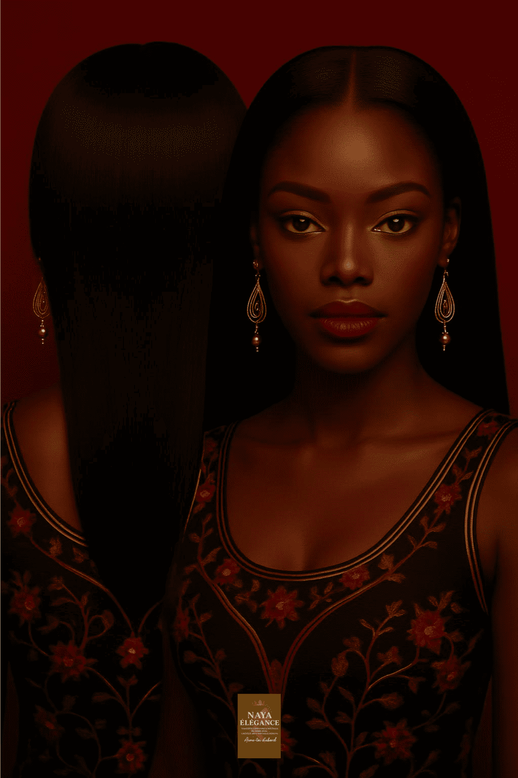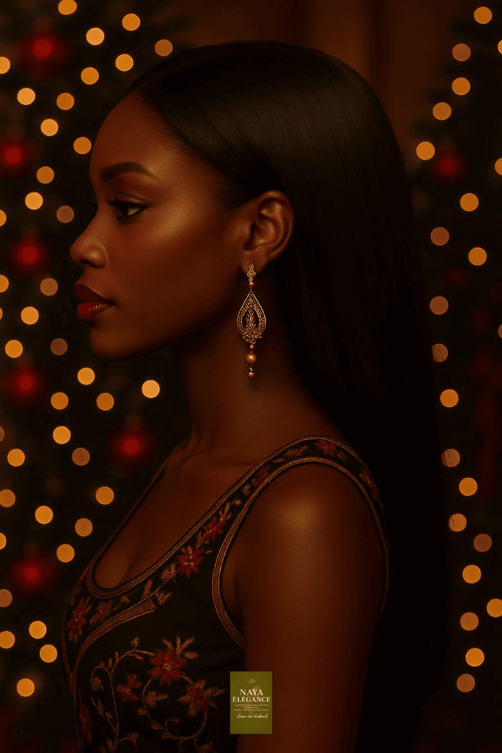 ✅ Ébène Profond™ : or mat ou bronze foncé. • Bijoux : or vieilli, cuivre patiné, ou perles noires. • Maquillage : rouge vin, cuivre foncé, highlighter or profond.