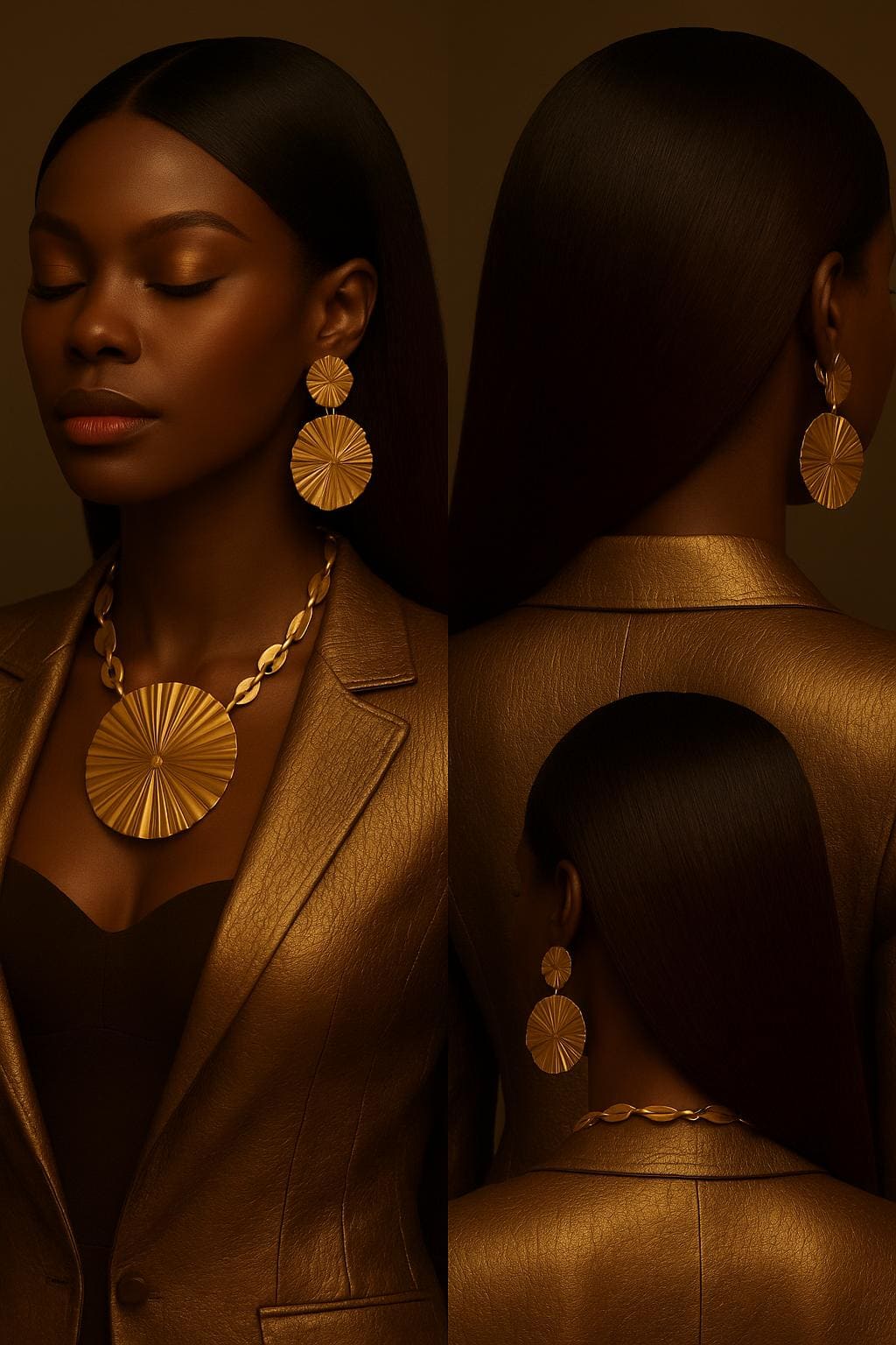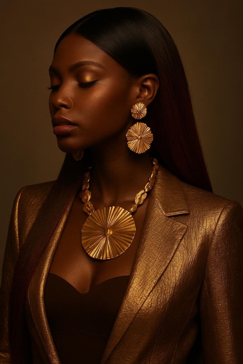 ✅ Ébène Profond™ : or mat ou bronze foncé. • Bijoux : or vieilli, cuivre patiné, ou perles noires. • Maquillage : rouge vin, cuivre foncé, highlighter or profond.