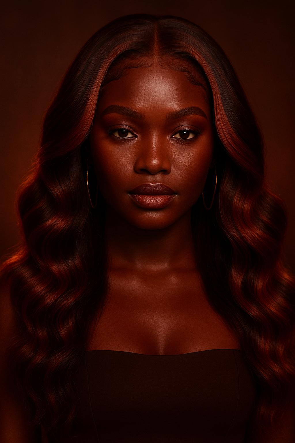 Parfaite au printemps, en été et en automne, Aime-toi N°75, Brun Acajou Velouté™ (#FS4/530) : perruque longue 22″ en cheveux naturels indiens, nuance chaude et satinée, idéale pour profils Ébène Chaud™, Cacao Neutre™ et Chocolat Acajou™.