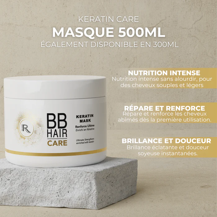 Le Masque Soin Keratin Care– BBHairest un soin intensequi aide àrestaurer la santé et la beauté des cheveux, les rendant doux, soyeux et faciles à coiffer. Grâce à sa formule qui contient de la kératine hydrolysée, les zones fragiles du cheveu sont soignées. Il facilite le démêlage et apporte instantanément brillance et douceur.